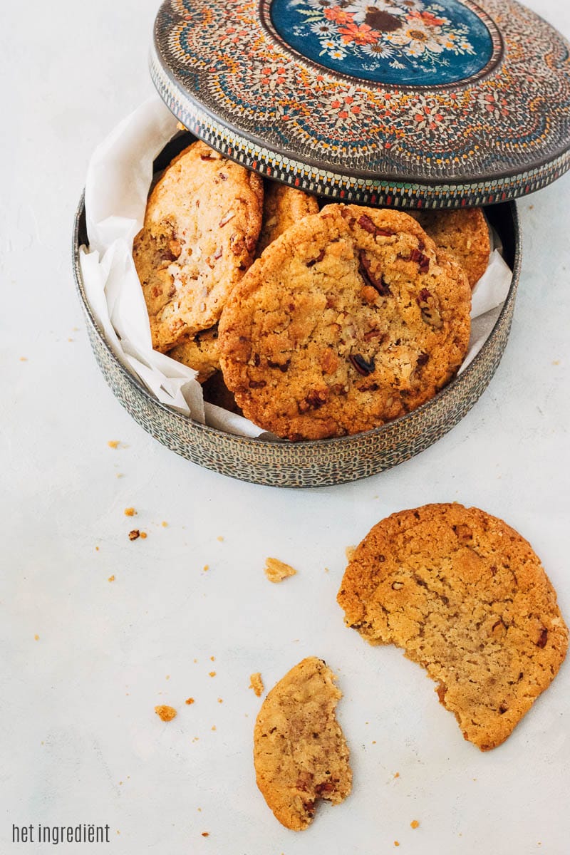 Ik vond het voor deze koeken leuk om 3 verschillende manieren van styling te laten zien dus daarom heb ik verschillende foto’s gemaakt. Er zijn natuurlijk oneindig veel manieren maar ik heb gekozen voor een setting waarbij de koeken op een taartrooster liggen, een setting waarbij ze in een schaal liggen en tenslotte nog een setting waarbij de koeken in een trommel zitten. Het zijn zomaar wat ideeën waar je hopelijk wat inspiratie uit kunt halen als je ook graag je gerechten op de foto zet!